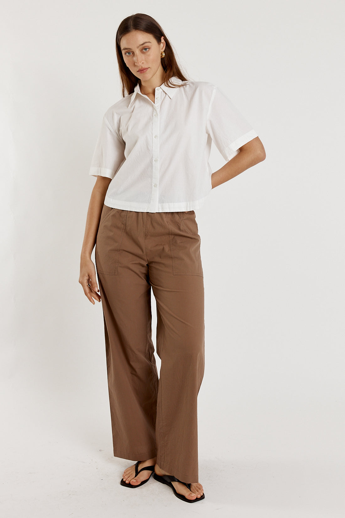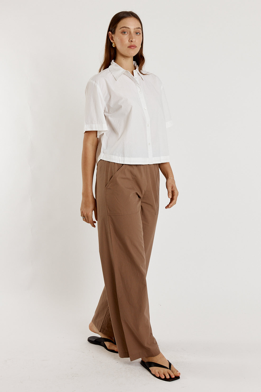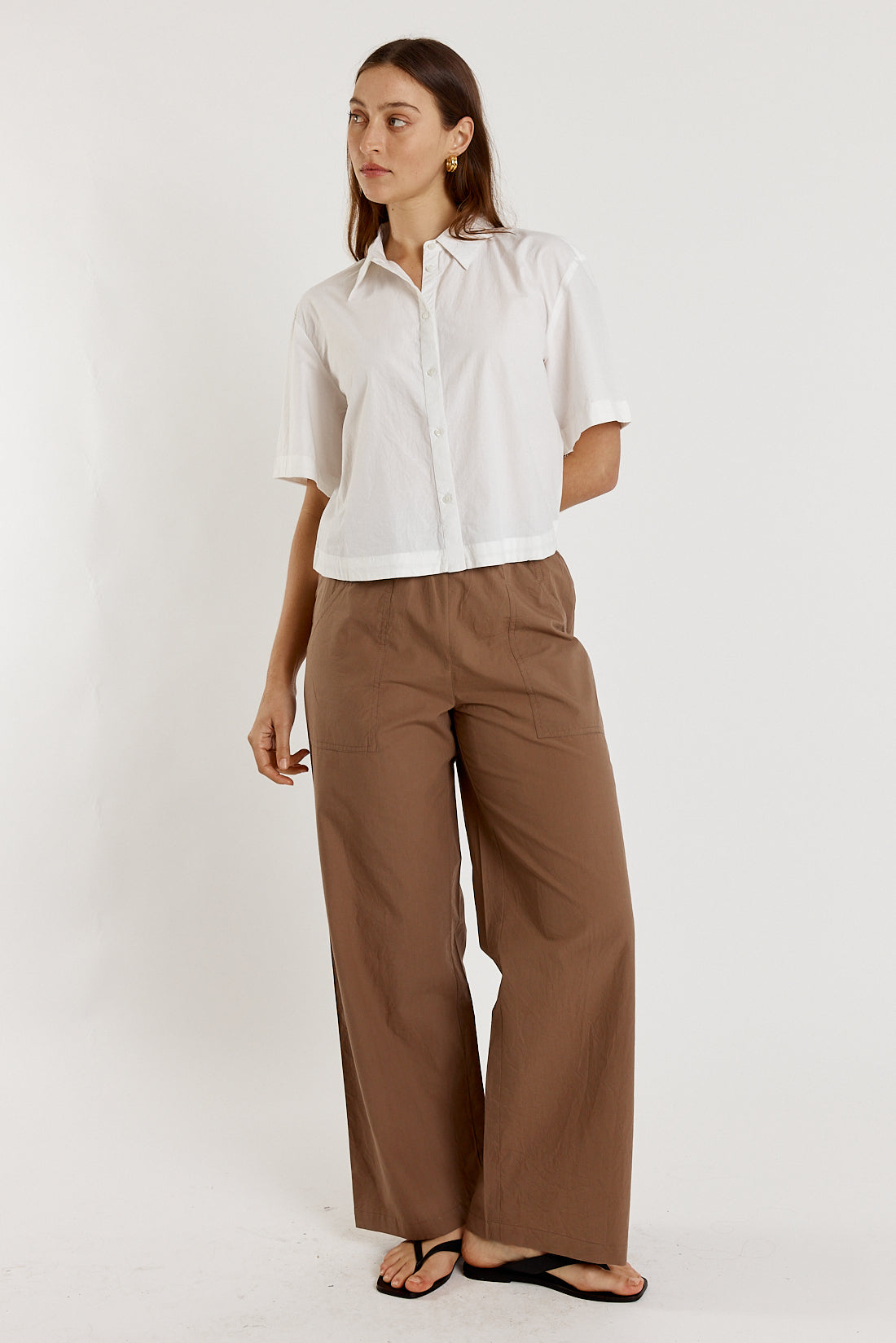 Crafted from 100% cotton poplin, the Giliann Casa Pant in Donkey offers a refined silhouette with a sophisticated diagonal pocket detail.